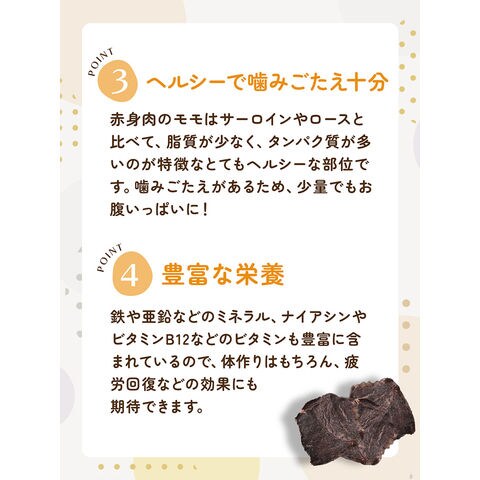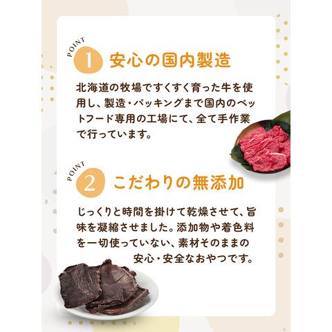 | 特長 | ●自然豊かな北海道の牧場ですくすく育った牛のモモ肉を使った、とっても嗜好性が高い犬用ジャーキーです。 ●牛モモ肉を食べやすい大きさ・厚さにカットしてから、国内のペットフード専用工場にてじっくりと乾燥させて、旨味を凝縮させました。 ●安心・安全のために添加物や着色料は含まれていない、国産牛100%の素材そのままおやつです。また、小麦粉などの穀物も使用しておりませんので、穀物アレルギーの愛犬にも安心して与えて頂けます。 |