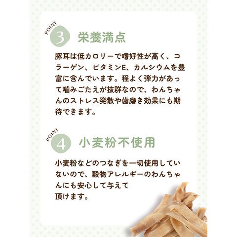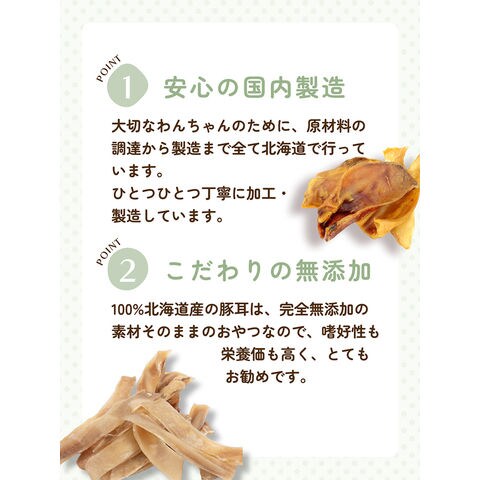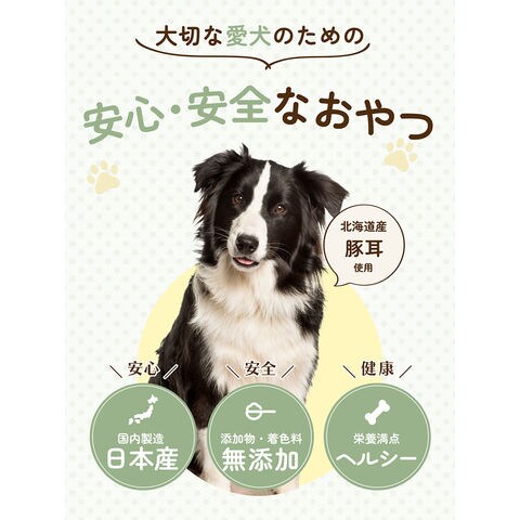 | 特長 | ●新鮮な北海道産の豚耳のみを使用した、素材そのままの犬用おやつです。 ●豚耳は低カロリーで嗜好性が高く、コラーゲン、ビタミンE、カルシウムを豊富に含んでいます。 ●程よく弾力があってかみ応えが抜群なので、わんちゃんのストレス発散や歯磨き効果にも期待できます。適度に長持ちするおやつなので、お留守番の際にもおすすめです。 ●小麦粉などの穀物を一切使用していないため、穀物アレルギーのわんちゃんにも安心して与えて頂けます。 |