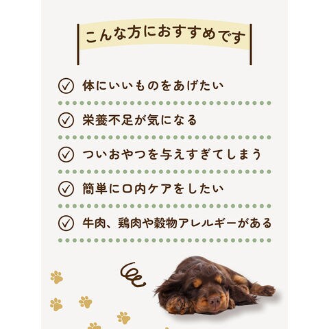 | 注意 | ※生後6ヶ月未満の幼犬には与えないでください。 ※手作りのため、色、形、匂い、硬さに若干の違いがあります。肉由来の脂肪分や血液の固まりや染みが残っている場合がありますが、品質には問題なくむしろ旨味となりますので、安心してお与え下さい。 |