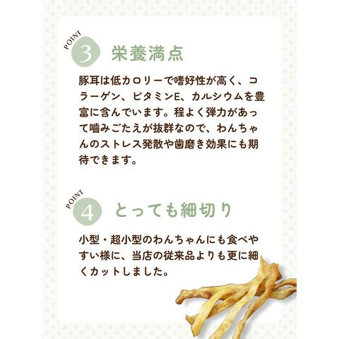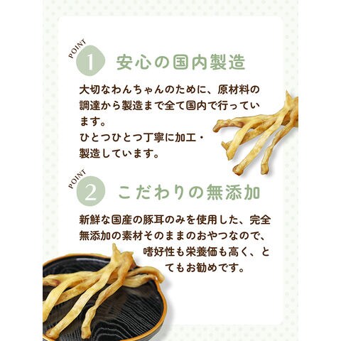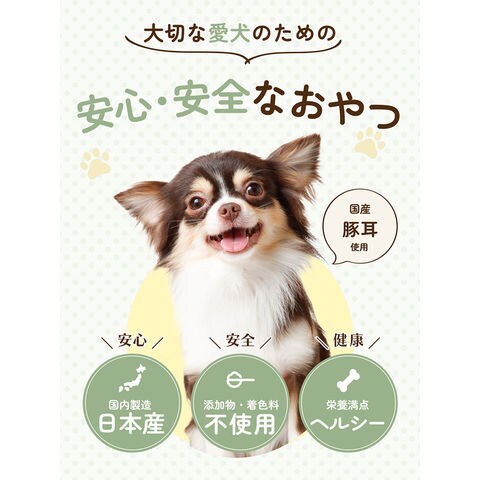 | 特長 | ●新鮮な国産の豚耳のみを使用した、素材そのままの犬用おやつです。 ●豚耳は低カロリーで嗜好性が高く、コラーゲン、ビタミンE、カルシウムを豊富に含んでいます。 ●程よく弾力があってかみ応えが抜群なので、わんちゃんのストレス発散や歯磨き効果にも期待できます。適度に長持ちするおやつなので、お留守番の際にもおすすめです。 ●小麦粉などの穀物を一切使用していないため、穀物アレルギーのわんちゃんにも安心して与えて頂けます。 |