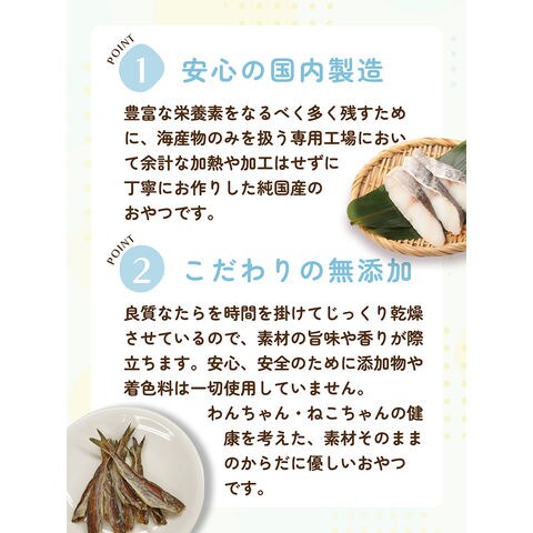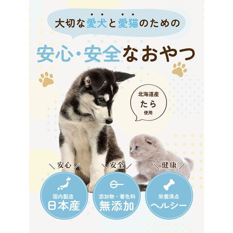 | 特長 | ●添加物を一切使用していない純国産の安心・安全な犬猫用おやつです。肉類や穀物アレルギーにお悩みの方にとってもおすすめです。 ●北海道近海で水揚げされた新鮮で良質なたらをそのまま乾燥しました。ねこちゃんや小型のわんちゃんが食べやすい様に小さ目のたらを使用しています。 ●たらは身が柔らかく高タンパクで低カロリーなヘルシー食材なので、お魚のおやつの中でも特に人気が高いです。造血作用があるビタミンB12、健康な骨の維持に欠かせないビタミンD、強い抗酸化性作用があるビタミンEが豊富に含まれています。 |