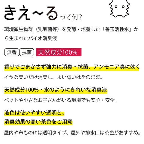 メーカー画像 きえ~るH 小動物用 消臭剤 環境大善 100mL 4962159800459 環境ダイゼン 消臭 消臭スプレー 犬 いぬ dog 猫 ねこ cat 小動物 モモンガ リス ハムスター 小鳥 鳥 爬虫類 昆虫 観賞魚 バイオ消臭液 酵素 悪臭 抗菌 無添加 乳酸菌 環境微生物群 天然成分 天然成分100% 善玉菌 本体 きえーる アンモニア臭 マーキング 糞 ふん 尿 おしっこ うんち 糞尿臭 臭い ニオイ 消臭 舐めても安心 舐めても安全 犬用品 猫用品 小動物用品 犬用 猫用 鳥用 小動物用 善玉活性水 国産 日本産 20250605 y25m06 ngtk