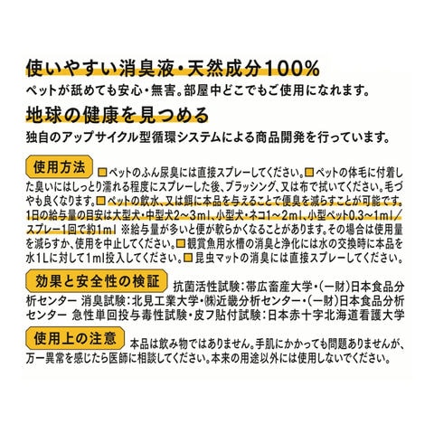 | 特長 | ●環境微生物群(乳酸菌等)を発酵・培養した「善玉活性水」から生まれたバイオ消臭スプレーです。 ●ふん尿臭・ケージまわりやペットキャリー、水槽、昆虫マットなど、幅広い消臭に活用できます。 ●ペットの体毛に付着した臭いにはしっとり濡れる程度にスプレーした後、ブラッシング、または布で拭いてください。 |