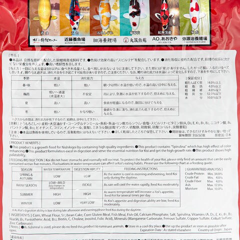 | ご注意 | ※本品は錦鯉用フードです。目的以外の用途では使用しないでください。 ※本品は魚粉を使用しておりますので、反芻(はんすう)動物には与えないでください。 ※涼しく乾燥したところで保管してください。また、開封後はできるだけすみやかに使い切ってください。 |