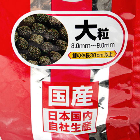 | 原材料 | フィッシュミール、小麦粉、とうもろこし、オキアミミール、スピルリナ、アルファルファミール、ビール酵母、大豆粕、糟糠類、海藻粉末、消化酵素、 アミノ酸(L-グルタミン酸ナトリウム、メチオニン)、ガーリック、カロチノイド、ビタミン類(塩化コリン、E、C、イノシトール、B5、B2、A、B1、B6、B3、K、葉酸、D3、ビオチン)、 ミネラル類(食塩、P、Fe、Mg、Zn、Mn、Co、Cu、I)、食用色素(青2) |
