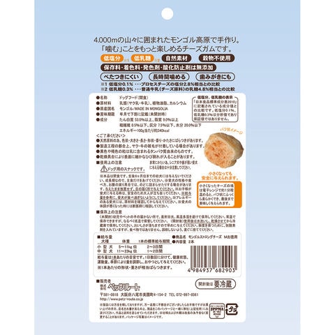 | 特長 | ●モンゴル高原で伝統的な製法で手作りされたチーズガムです。 ●じっくり乾燥しているので堅く、長時間噛むことを楽しめます。 ●低塩分、低乳糖で体にやさしく、保存料、着色料、発色剤、酸化防止剤は無添加です。 |