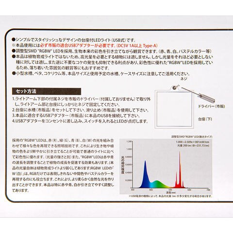 | ご注意 | ※本品はアクアリウム、コケリウムなどの観賞用LEDです。目的以外の用途では使用しないでください。 ※本品は室内専用となっておりますので屋外では使用しないでください。 ※本品使用時には必ず市販の適合USBアダプターが必要です。 ※本品は植物育成ライトではないため、高光量を必要とする植物には適しません。しかし光量をそれほど必要としない種に対しては適し、また逆に不要なコケの発生も抑制できる利点があり、彩色性に優れた“RGBW”LEDを採用しているため、落ち着いた雰囲気の観賞などにもおすすめです。 ※ |
