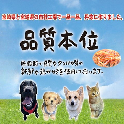 | 原材料 | 鶏肉(ササミ)、鰹節、グリセリン、酸化防止剤(亜硫酸Na、V.C、V.E)、調味料(アミノ酸)、リン酸塩(Na) |