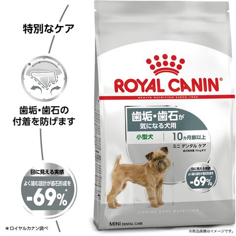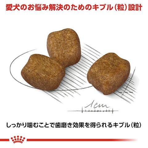 | 特長 | ●しっかりと噛み、そして噛むたびに歯が磨かれるように設計された特別なキブル(粒)。 ●歯の健康のため、人の歯磨きペーストにも使用されているポリリン酸ナトリウムを配合。 ●ミニデンタルケアを与えられた犬の歯石の形成が69%軽減(2018年ロイヤルカナン調べ)。 |