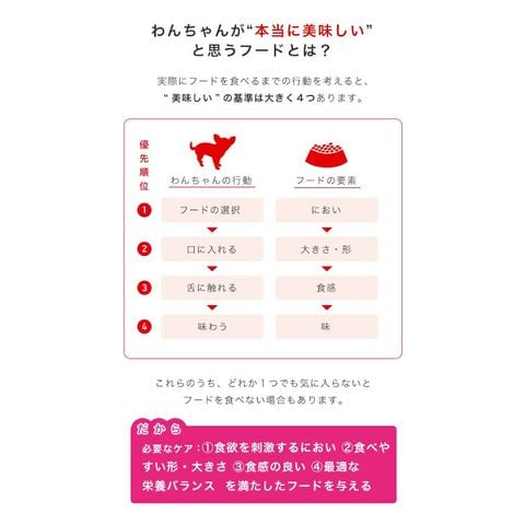 | 特長 | ●外は歯ごたえが良いサクサク、中は柔らかいクリーム。2つの食感を組み合わせた、好き嫌いがある子のためのケアフードです。 ●最適な栄養バランスと独自のアロマ成分を配合しました。 ●健康な皮膚と美しい被毛を維持するために、ルリチシャ油などをバランスよく配合。オメガ3系不飽和脂肪酸(EPA・DHA)も豊富に配合しています。 ●高品質なタンパク質をはじめ、原材料を厳選することで好き嫌いがある子でも喜んで食べるアロマ(香り)を実現しました。 |