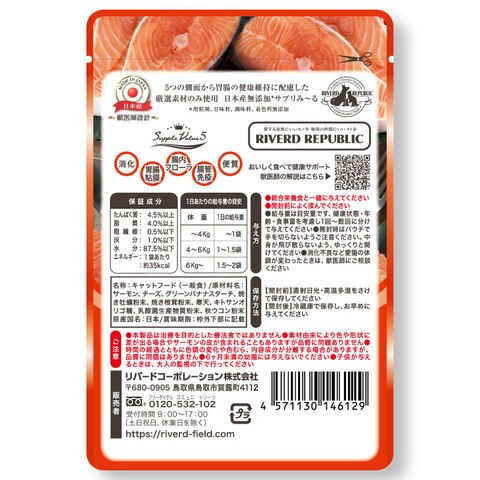 | 原材料 | サーモン、チーズ、グリーンバナナスターチ、焼き牡蠣粉末、焼き椎茸粉末、寒天、キトサンオリゴ糖、乳酸菌生産物質粉末、秋ウコン粉末 |