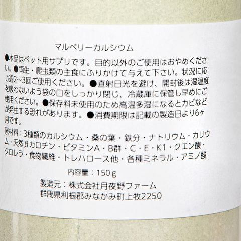 亀・爬虫類 陸ガメ 爬虫類用品 添加剤 マルベリーCa マルベリーカルシウム 150g 両生・爬虫類専用 飼料添加剤 爬虫類 両生類 サプリメント 添加剤 4571263260105 20250613 y25m06 mikari _soryo vD9WBy2_musr v9Wy_8V6rIv サプリメント カルシウム剤 粉末 カルシウムパウダー パウダー マルベリー 桑 桑の葉 クロレラ ビタミン l_nd3 size_unmeasure Chlorella カルシューム リクガメ 月夜野 ツキヨノ