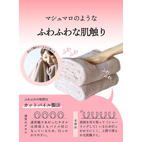 | 特長 | ●吸水性・速乾性を兼ね備えたマイクロファイバー製のバスタオルです。 ●いつものタオルに抜群の吸水力は、まるでマシュマロのような柔らかさ、使ってみて納得する頼もしい吸水力です。 ●表面を刈り取って(シャーリングして)いるため引っかかりにくく、上質で滑らかな肌触りです。 |