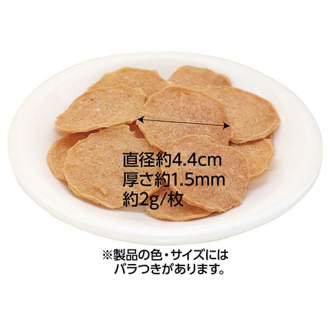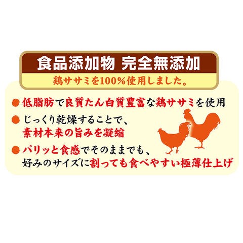 | 特長 | ●低脂肪で良質たん白質豊富な鶏ササミを使用した犬用おやつです。 ●じっくり乾燥することで素材本来の旨みを凝縮しました。 ●パリッと食感でそのままでも、好みのサイズに割っても食べやすい極薄仕上げです。 ●食品添加物完全無添加です。 ●お得な大容量タイプです。 |