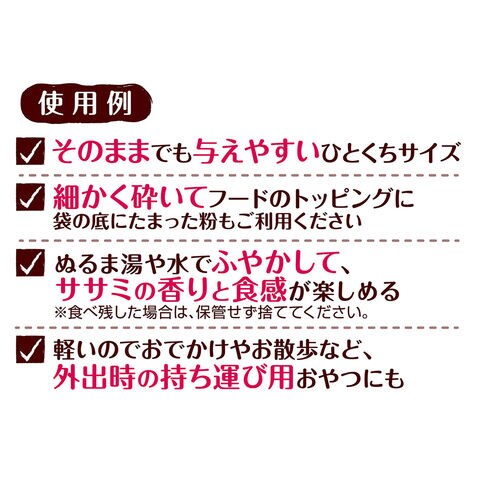 | 特長 | ●そのままでも与えやすいひとくちサイズの犬用おやつです。 ●細かく砕いてフードのトッピングに、ふやかして素材の香りと食感を楽しめる、軽いのでおでかけやお散歩など外出時の持ち運び用おやつなど、様々な目的に合わせてアレンジできます。 ●食品添加物完全無添加です。 ●シニア犬、パピー犬にもおすすめです。 |