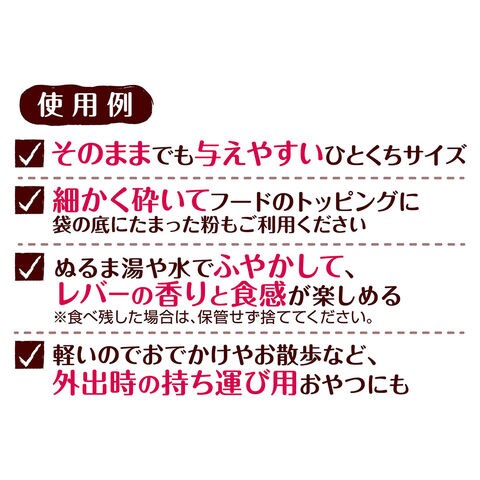 | 特長 | ●そのままでも与えやすいひとくちサイズの犬用おやつです。 ●細かく砕いてフードのトッピングに、ふやかして素材の香りと食感を楽しめる、軽いのでおでかけやお散歩など外出時の持ち運び用おやつなど、様々な目的に合わせてアレンジできます。 ●食品添加物完全無添加です。 ●シニア犬、パピー犬にもおすすめです。 ●鉄分豊富です。 |