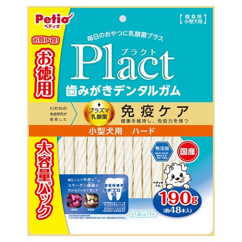 | 特長 | ●KIRINの免疫研究が発見した「プラズマ乳酸菌」を配合した犬用おやつです。 ●かむことで牛皮のコラーゲン繊維が歯の汚れをからめて落とします。 ●Plactはペットの健康を考えて乳酸菌をプラスしたブランドです。 ●グレインフリーだからワンちゃんの健康サポート、食物アレルギーケアができます。 ●着色料、保存料、酸化防止剤、香料無添加です。 |