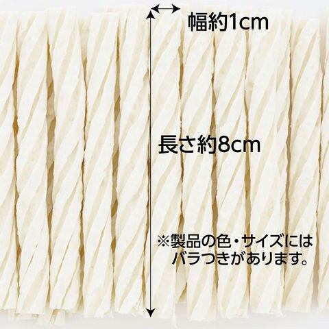 | ご注意 | ※本品は犬用おやつです。対象以外の動物には与えないでください。 ※間食用です。主食として与えないでください。 ※犬の食べ方や習性によっては、のどに詰まらせることがありますので必ず観察しながらお与えください。 ※消化器官が未発達な1歳未満の幼犬や、のどに詰まらせることがある中型犬~超大型犬には与えないでください。 ※別記の与え方の給与量、および保存方法をお守りください。 ※子供がペットに与える場合は、大人が立ち会ってください。 ※幼児、子供、ペットのふれない所に保管してください。 ※品質保持のための脱酸素剤は、無害ですが食べ物ではありません。また、開封後に発熱する場合がありますが、問題ありません。 ※消化不良など愛犬の体調が変わった場合は獣医師にご相談ください。 ※本品は天然素材を使用しておりますので、色やにおいに多少のバラツキがあります。また、時間の経過とともに変色する場合がありますが、品質には問題ありません。 ※製造工程上、形状、サイズ、硬さなどに多少のバラツキがあります。 ※製品中に見られる小さな茶色や黒色の斑点は牛皮成分です。 ※本品をかむことで歯こうがつきにくくなりますが、既に沈着している歯石の除去には適しません。 ※イメージ写真と製品に多少の違いがあります。 |