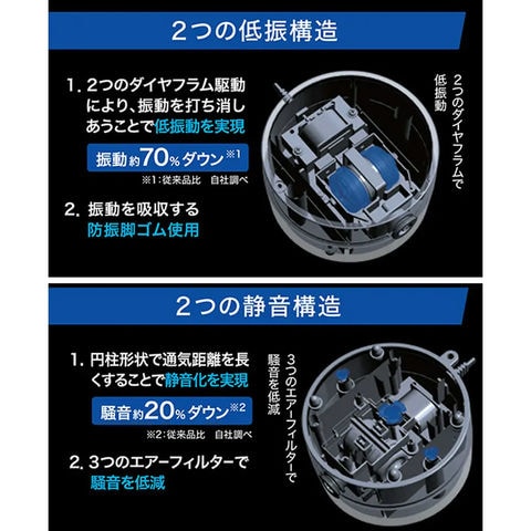 【サイレントフォース 2000S】 定格電圧/周波数:AC100V 50/60Hz 定格消費電力:1.8W(50Hz)/1.7W(60Hz) 吐出量(無負荷時):2.0L/分 1日あたり電気代(連続使用、1kWh=25円の場合):約1.1円(50Hz) 約1.1円(60Hz) 吐出口:1口 【ベストバイオエアー 50】 原材料:石英砂、エポキシ樹脂、石材専用着色料、PVC、バチルス属細菌(バチルスプミルス) |