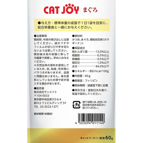 メーカー画像 サンメイト CAT JOY パウチ まぐろ 60g 4523294011140 猫 ねこ ネコ キャットフード 猫フード 猫用フード ウェットタイプ ウェットフード ウエット ウエットフード 一般食 まぐろ マグロ 鮪 キャットジョイ やわらかめ 柔らかい 水分補給 ゼリー 着色料不使用 発色剤不使用 餌 えさ エサ ご飯 ごはん ゴハン ボール売り ボール まとめ 纏め売り まとめ買い 20250623 kak y25m06