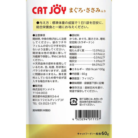 メーカー画像 サンメイト CAT JOY パウチ まぐろ・ささみ入り 60g 4523294011157 猫 ねこ ネコ キャットフード 猫フード 猫用フード ウェットタイプ ウェットフード ウエット ウエットフード 一般食 まぐろ マグロ 鮪 ささみ ササミ 鶏肉 キャットジョイ やわらかめ 柔らかい 水分補給 ゼリー 着色料不使用 発色剤不使用 餌 えさ エサ ご飯 ごはん ゴハン ボール売り ボール まとめ 纏め売り まとめ買い 20250623 kak y25m06 catday2026snmt catday2026