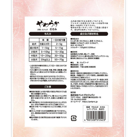 | 原材料 | 国産鶏肉(九州産)、鶏レバー、食塩、保湿剤(グリセリン)、酸化防止剤(プロピレングリコール)、酸味料、焼成カルシウム、調味料(有機酸) |