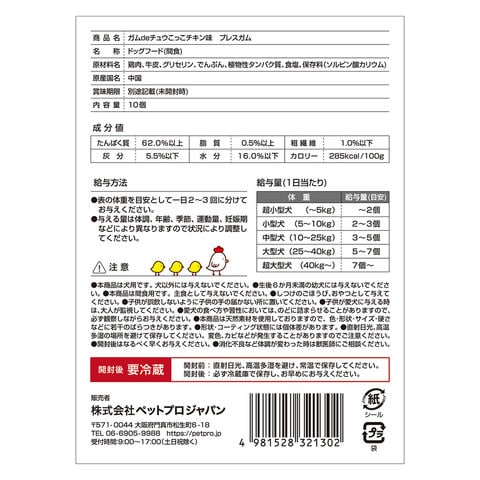 | 原材料 | 鶏肉、牛皮、グリセリン、でんぷん、植物性タンパク質、食塩、保存料(ソルビン酸カリウム) |