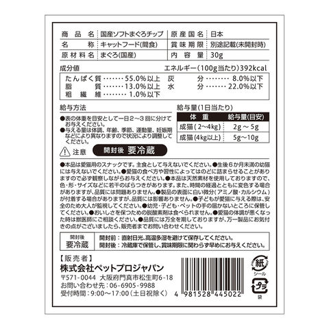 | 特長 | ●国産100%のまぐろチップをソフトに仕上げた猫用おやつです。 ●着色料、保存料、酸化防止剤などの添加物不使用です。 |