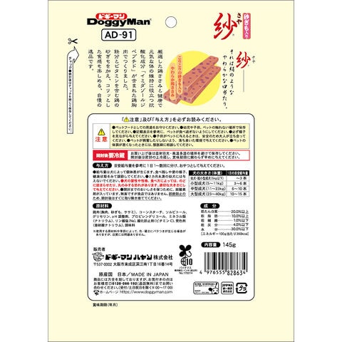 メーカー画像 ドギーマン 紗 砂ぎも入り 145g 4976555828634 さや ドッグフード 犬フード 間食 おやつ 犬おやつ 犬用おやつ トリーツ ご褒美 ごほうび 犬 イヌ いぬ DOG 犬用 犬の餌 犬えさ 犬餌 ペットフード どっぐふーど ジャーキー スナック しっとり なめらか 細切り スティック 歯ざわり やわらかい ソフトタイプ ソフト チキン 鶏肉 砂肝 鶏ササミ 鶏ささみ ササミ ささみ 鶏胸肉 鶏むね肉 むね肉 胸肉 小型犬 シニア犬 高齢犬 老犬 イミダゾールジペプチド 国産 日本産 どぎーまん ドギーマンハヤシ 20250627 y25m07 ngtk dgycp2512all