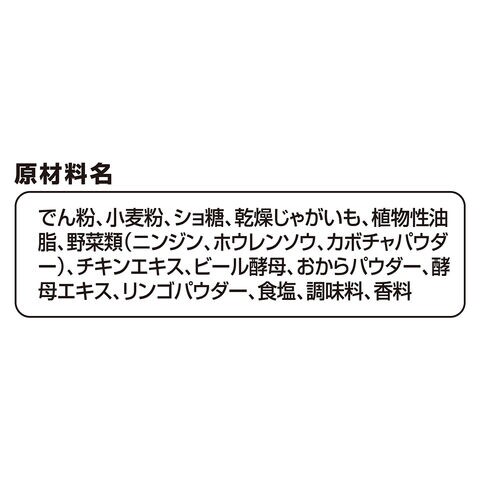 | 原材料 | でん粉、小麦粉、ショ糖、乾燥じゃがいも、植物性油脂、野菜類(ニンジン、ホウレンソウ、カボチャパウダー)、チキンエキス、ビール酵母、おからパウダー、酵母エキス、リンゴパウダー、食塩、調味料、香料 |