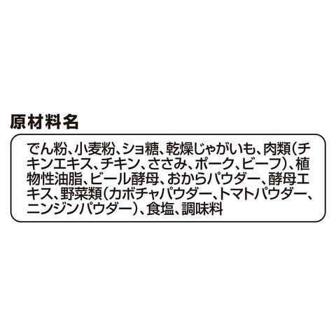 原材料 でん粉、小麦粉、ショ糖、乾燥じゃがいも、肉類(チキンエキス、チキン、ささみ、ポーク、ビーフ)、植物性油脂、ビール酵母、おからパウダー、酵母エキス、野菜類(カボチャパウダー、トマトパウダー、ニンジンパウダー)、食塩、調味料