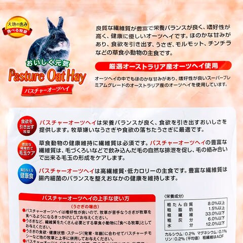 | 特長 | ●嗜好性が高く、健康に優しいオーツヘイです。 ●良質な繊維質が豊富で栄養バランスが良く、ほのかな甘みがあります。 ●よく噛むことで適度に歯が摩耗して不正工合のケアに役立ちます。 ●低カロリーなので食べ過ぎや太り過ぎが気になるペットのダイエットに最適です。 ●うさぎ、モルモット、チンチラなどの草食動物の主食としておすすめです。 |