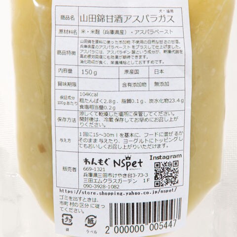 JINJIN おやつ 山田錦甘酒 アスパラガス 150g 無添加 2000000005447 ジンジン NSpet わんもぐ エヌエスペット 犬 イヌ いぬ 犬用 いぬ用 dog DOG 犬フード ドッグフード どっぐふーど 犬おやつ 猫 ネコ ねこ 猫用 ねこ用 dog DOG cat CAT ペットフード 犬フード 猫フード ドッグフード キャットフード どっぐふーど きゃっとふーど 犬おやつ 猫おやつ トリーツ 甘酒 山田錦 自然な甘さ 飲む点滴 栄養補給 消化吸収が良い ヘルシー 新陳代謝 疲労回復 アスパラギン酸 混ぜて トッピング 添加物不使用 国産 日本産 20250711 y25m07 ngtk 4560366066479 amazake