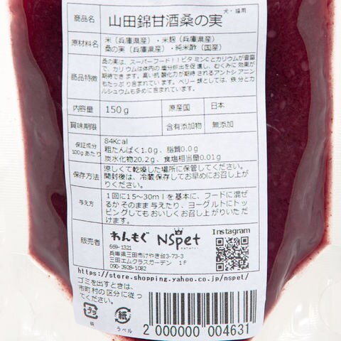 JINJIN おやつ 山田錦甘酒 桑の実 150g 無添加 2000000004631 ジンジン NSpet わんもぐ エヌエスペット 犬 イヌ いぬ 犬用 いぬ用 dog DOG 犬フード ドッグフード どっぐふーど 犬おやつ 猫 ネコ ねこ 猫用 ねこ用 dog DOG cat CAT ペットフード 犬フード 猫フード ドッグフード キャットフード どっぐふーど きゃっとふーど 犬おやつ 猫おやつ トリーツ マルベリー 甘酒 山田錦 自然な甘さ 飲む点滴 栄養補給 消化吸収が良い カリウム 塩分を輩出 むくみ改善 アントシアニン 鉄分 カルシウム 健康維持 ヘルシー 混ぜて トッピング 添加物不使用 国産 日本産 20250711 y25m07 ngtk 4560366066493 amazake