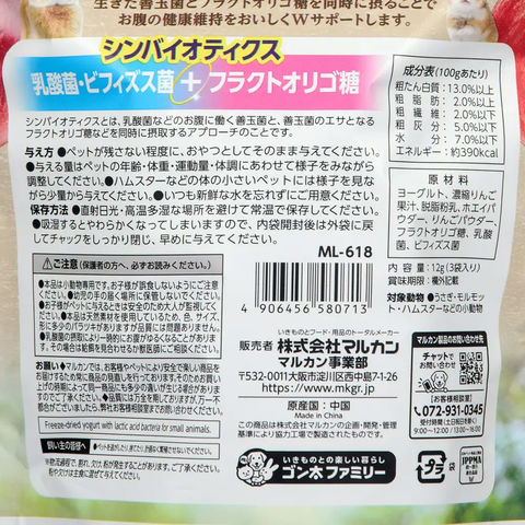 | 特長 | ●砂糖、デンプン類を一切使用せず、ヨーグルトの風味、栄養をそのままフリーズドライした小動物用のおやつです。 ●生きた善玉菌とフラクトオリゴ糖を同時に摂ることで、お腹の健康維持をおいしくWサポートします。 ●小分けで入っており、外袋にもチャックがついているので保存に便利です。 |