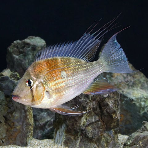 | 種類詳細 | 南米に広く分布するゲオファーガスに近縁な1属1種のシクリッドです。 本種はやや体高のある体系と黄色味がかった体色に青く染まるウロコが美しい種で、オスメスともに成長すると背ビレのフィラメントが伸張します。 飼育、繁殖ともに容易で、サイズが同程度の中型種同士であれば混泳も可能ですが、成長とともにやや気が荒くなり発情したペアは気が荒くなるため注意が必要です。 繁殖はペアで行われ、流木や石などの基質に産卵しメスが卵を咥えるマウスブリーダーです。 |