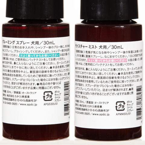 | 使用方法 | 【グルーミングスプレー】 日常のお手入れやシャンプー後のブロー時に、犬の体全体にスプレーし、ブラッシングして下さい。 また、シャンプー前の毛玉取りにもお使いください。 【モイスチャーミスト】 乾燥が気になる時やシャンプー後の保湿にお使いください。 犬の被毛をかき分けて皮膚に直接スプレーし、馴染ませてください。 一日に何度でもお使いいただけます。 |