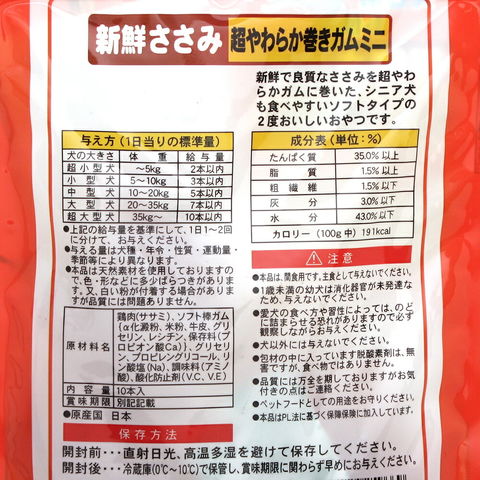 | 原材料 | 鶏肉(ササミ)、ソフト棒ガム{α化澱粉、米粉、牛皮、グリセリン、レシチン、保存料(プロピオン酸Ca)}、グリセリン、プロピレングリコール、リン酸塩(Na)、調味料(アミノ酸)、酸化防止剤(V.C、V.E) |