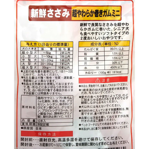 | 原材料 | 鶏肉(ササミ)、ソフト棒ガム{α化澱粉、米粉、牛皮、グリセリン、レシチン、保存料(プロピオン酸Ca)}、グリセリン、プロピレングリコール、リン酸塩(Na)、調味料(アミノ酸)、酸化防止剤(V.C、V.E) |