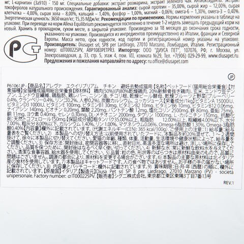 | 保証成分 | 粗タンパク質:35.00%以上、粗脂肪:12.00%以上、粗繊維:4.00%以下、水分:7.00%以下、粗灰分:8.00%以下、カルシウム:1.40%、リン:1.00%、マグネシウム:0.06%、オメガ6脂肪酸:1.30%、オメガ3脂肪酸:0.40% |