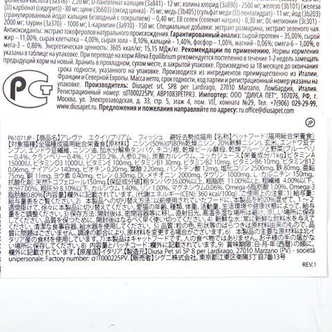 | 原材料 | ニシン(50%)(内80%乾燥ニシン、20%新鮮ニシン)、玄米、エンドウ豆デンプン、エンドウ豆繊維、ニシン油、加水分解魚タンパク、チコリ根、乾燥ビール酵母、乾燥フルーツと野菜(ブルーベリー0.4%、クランベリー0.4%、リンゴ0.2%、人参0.2%)、炭酸カルシウム、ユッカジュース |