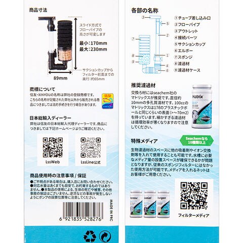 ※本品は熱帯魚・海水魚用ろ過器です。目的用途以外に使用しないでください。 ※水槽内に設置して使用してください。接続に使用するポンプやチューブは別売りです。 ※エアーポンプは発売メーカーの指示に従って設置し、使用してください。 |