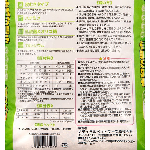 NPF エクセル おいしい小鳥の食事 シニア 1.8kg 主食 セキセインコ オカメインコ 小動物用品 鳥 インコ 小鳥 小型インコ セキセイインコ セキセイ 文鳥 十姉妹 綿花鳥 オカメインコ マメルリハ ジュウシマツ カナリア ブンチョウ フィンチ オカメ コザクラ ボタン サザナミインコ サザナミ キンカチョウ 錦華鳥 アワ 粟 ヒエ 稗 キビ 黍 カナリアシード粉 蜂蜜 ハチミツ 主食 シード シード食 穀類 穀物 カキガラ ボレー ボレー粉 カキ殻 牡蠣殻 kak y25m09 20250925 4932804365213 シニア 老鳥 鳥用品