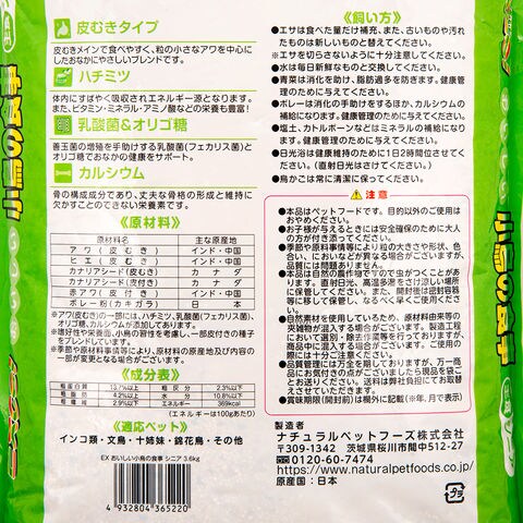 | 原材料 | アワ(皮むき)、ヒエ(皮むき)、カナリアシード(皮むき)、カナリアシード(皮付き)、赤アワ(皮付き)、ボレー粉(カキガラ) ※アワ(皮むき)の一部には、ハチミツ、乳酸菌(フェリカス菌)、オリゴ糖、カルシウムが添加してあります。 ※嗜好性や栄養面、小鳥の習性を考慮し、一部皮付きの種子をブレンドしています。 |