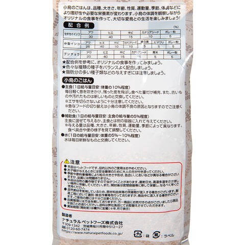 | ご注意 | ※本品は鳥用フードです。目的以外のご使用はおやめください。 ※季節や原料事情等により粒の大きさや形状、色合い、においなどが異なる場合がございますが、品質には問題ありません。 ※本品は自然の農作物ですので虫がつくことがあります。直射日光、高温多湿をさけ涼しい場所に保管してください。また、開封後は密閉容器等に移して保管し、なるべく早くご使用ください。 |