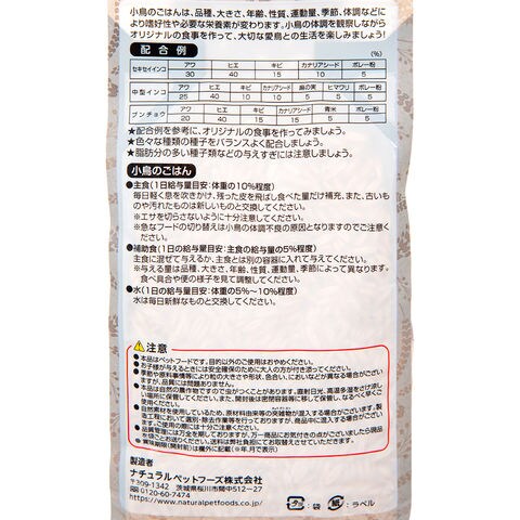 | ご注意 | ※本品は鳥用フードです。目的以外のご使用はおやめください。 ※季節や原料事情等により粒の大きさや形状、色合い、においなどが異なる場合がございますが、品質には問題ありません。 ※本品は自然の農作物ですので虫がつくことがあります。直射日光、高温多湿をさけ涼しい場所に保管してください。また、開封後は密閉容器等に移して保管し、なるべく早くご使用ください。 |