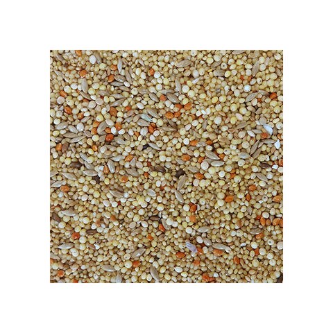 | 原材料 | アワ(皮むき)、ヒエ(皮むき)、キビ(皮むき)、カナリアシード(皮付き)、カナリアシード(皮むき)、赤アワ(皮付き)、赤キビ(皮付き)、ボレー粉(カキガラ) ※アワ(皮むき)の一部には、ハチミツ、乳酸菌(フェリカス菌)、オリゴ糖、カルシウムが添加してあります。 ※嗜好性や栄養面、小鳥の習性を考慮し、一部皮付きの種子をブレンドしています。 |