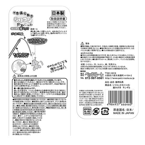 | ご注意 | ※猫の玩具以外の用途には使用しないでください。 ※一緒に遊ぶおもちゃです。飼い主が遊ばせ、シリコンを噛ませる歯磨き玩具ですので絶対に猫だけで遊ばせないでください。 ※万一、人やペットが部品を誤飲した時はすぐに医師に相談してください。 |