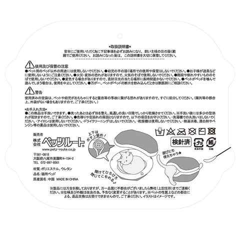 | ご注意 | ※本品は猫用のベッドです。目的以外の用途では使用しないでください。 ※幼児の手の届く場所での使用や保管はしないでください。 ※お子様が遊具などに使用しないようにご注意ください。 ※火災、変形の恐れがありますので、火気のそばで使用しないでください。 ※階段や倒れやすいもののそばで使用しないでください。 ※変色する場合がありますので、直射日光の当たる場所に長時間置かないでください。 ※ペットがベッドをかんで遊んでしまう場合は、使用を中止してください。 ※万が一、ペットがベッドの断片を飲み込んだときは獣医師にご相談ください。 ※使用済みの空袋は、ペットや幼児がおもちゃにすると窒息等の事故につながる恐れがありますので、すぐに処分してください。 ※洗濯機での丸洗いはしないでください。 ※アイロンは使用しないでください。 ※ドライクリーニング、乾燥機は使用しないでください。 ※熱湯消毒、漂白剤やベンジン等の薬品は使用しないでください。 |
