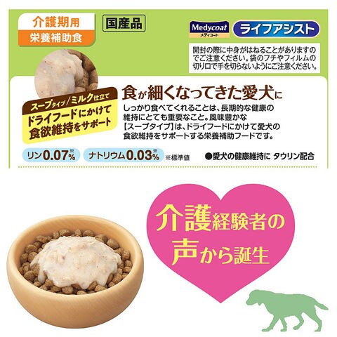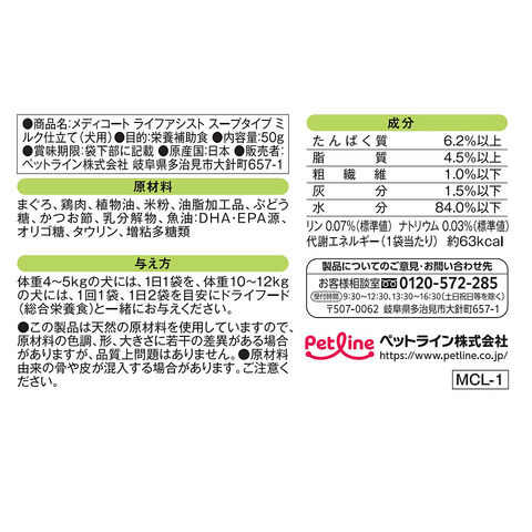 メディコート ライフアシスト スープタイプ ミルク仕立て 50g 4902418001630 犬 いぬ イヌ ドッグフード 犬フード ウェットフード ウエットフード ウェット ウエット 介護 介護期 国産 ペットライン 介護用 スープタイプ ミルク仕立 介護食 シニア ハイシニア 高齢 高齢犬 シニア犬 kak y26m02 20260221 チキン 鶏 鶏肉 マグロ 鮪 ジェル